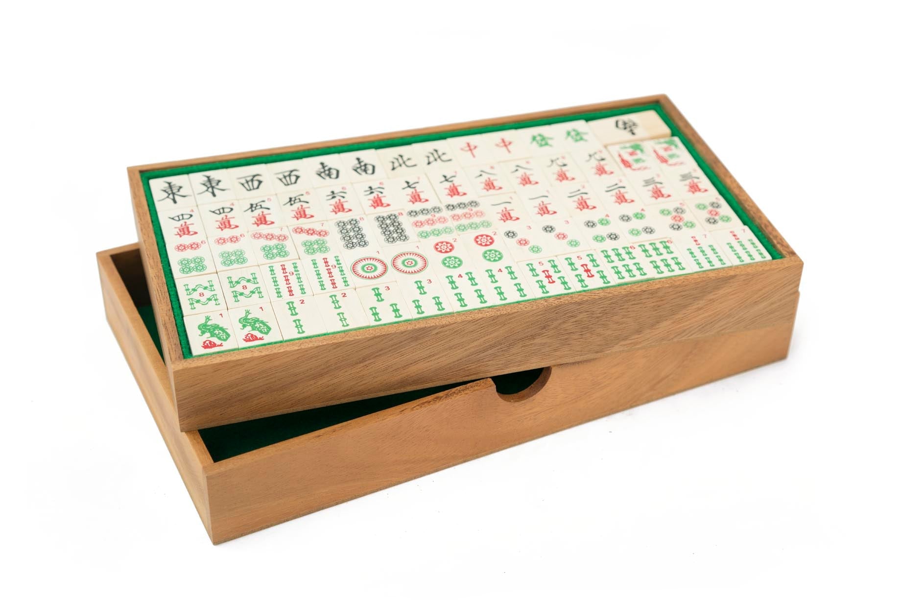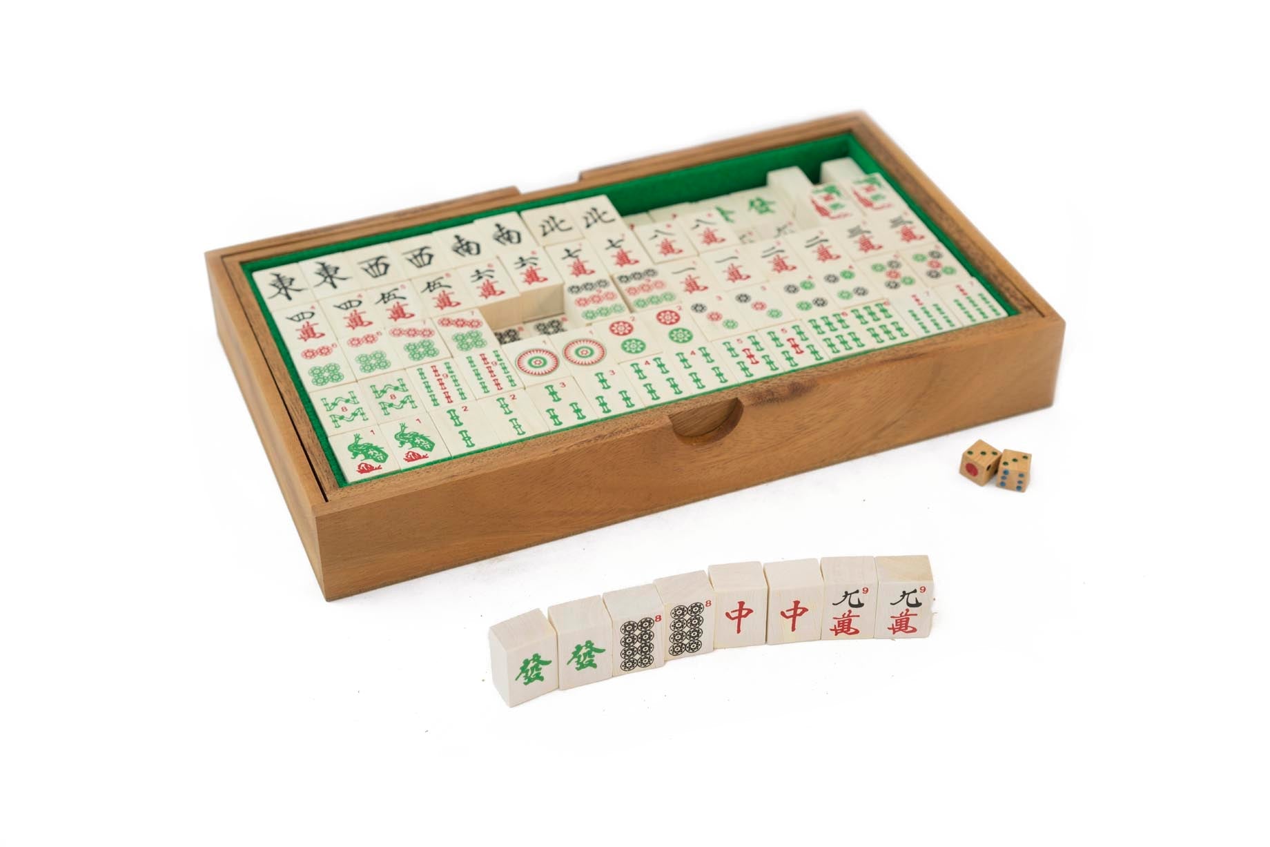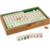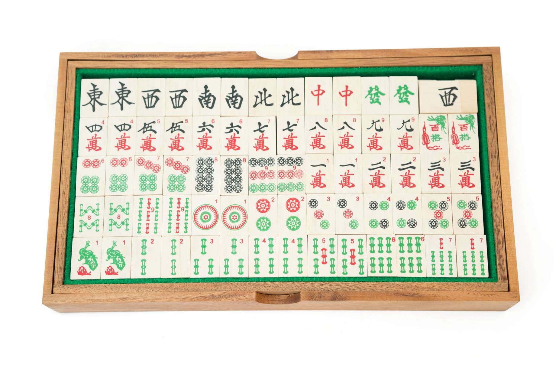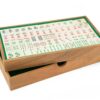Mahjong is a game of skill, strategy, and calculation which also involves a degree of chance. The game is of Chinese origin and is usually played by four persons with 144 domino-like tiles that are drawn and discarded until one player secures a winning hand. The object of play is similar to that of the Rummy card games, due to the presence of groups of tiles called melds that form the “legal”, or winning, hands. The name was coined by J. P. Babcock, who introduced the game to the West after World War I. Our handmade wooden Mahjong game comes with beautifully colored print symbols on the tiles pieces and a wooden box.