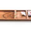 This 4-Track Cribbage Set is made from natural wood and has a specially designed board that allows more players than usual to join in the fun! Each track represents a player’s journey towards the end of the board as they collect points each turn from the hand they are dealt. The objective of Cribbage is to be the first player to score a target number of points, typically 61 or 121. Points are determined by card combinations from your own hand or from playing off of your opponent’s cards, making this a game of both luck and skill intertwined. Our 4-person board is handmade and comes with a full deck of playing cards and 12 pegs – all of which can be stored safely inside the box while it folds in half. Start your own family game night tradition with a timeless game that can be passed down from generation to generation!